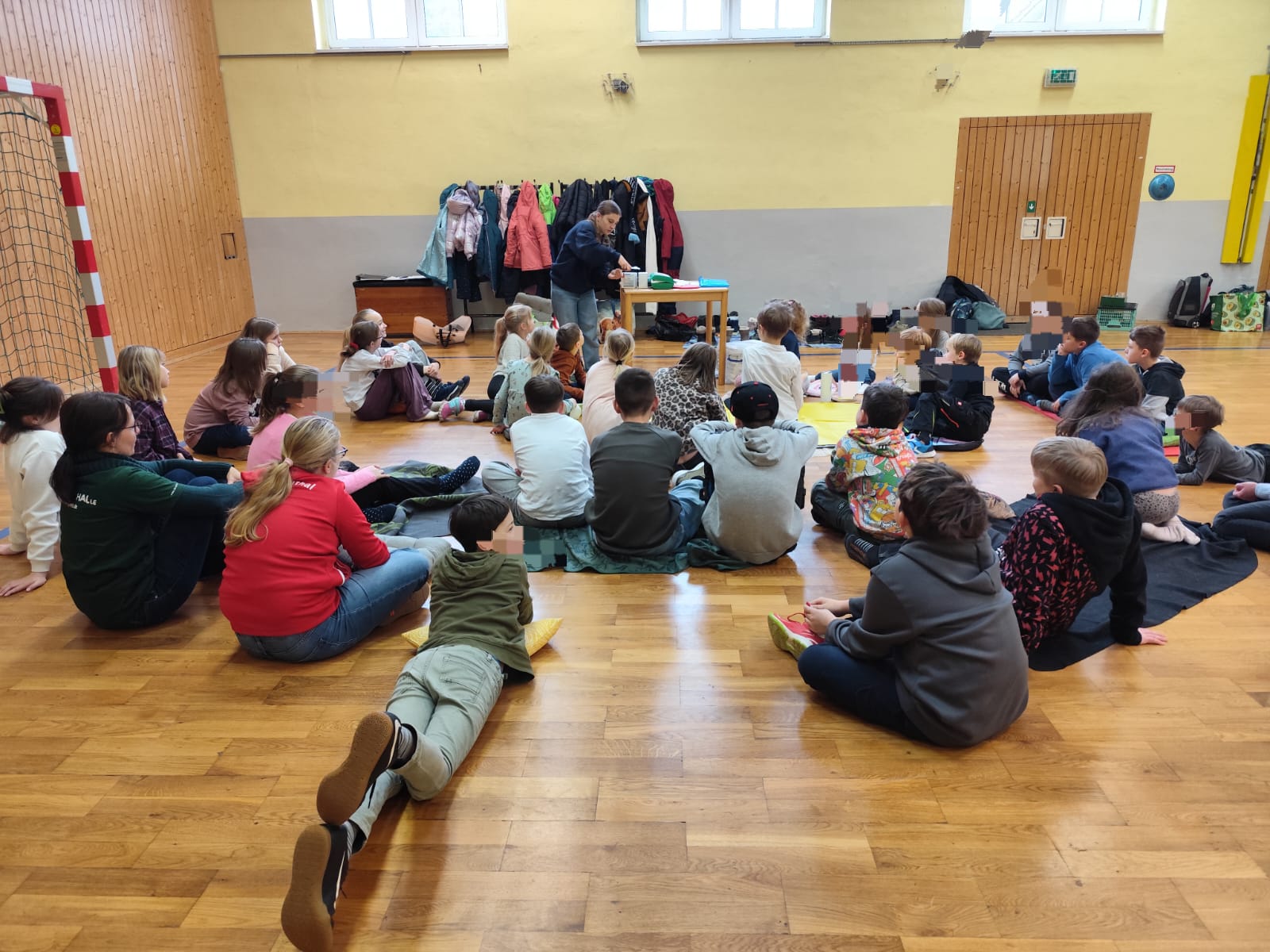 Nach der Theorie folgte der praktische Teil, bei dem alle tatkräftig mit anpacken durften. Die Turnhalle verwandelte sich in ein Übungsgelände für angehende Ersthelfer: